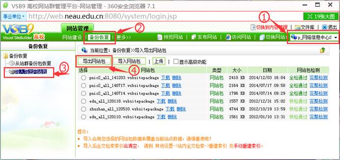 3. 进入备份恢复页面后,点击左侧树形菜单中的“导入导出网站包”,如图1.1所示步骤3;