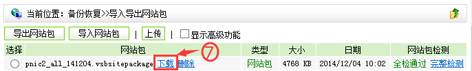 7. 在如图1.4所示界面中,点击“下载”,可以将网站中已有的网站备份包下载到本地保存;