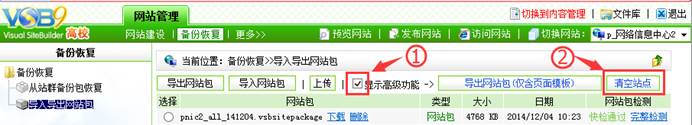 2.若您的站点是非空站,需要备份站点,清空站点,再使用系统提供模板包建站。若对模板包不满意,可以清空站点重新选择模板包修改使用,或将原站点备份包恢复。