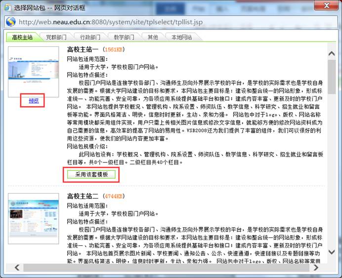 2. 进入如图3.2所示“选择网站包”对话框,系统提供了大量的模板包供用户使用,用户可以通过点击“预览”查看模板包样式,选定某一模板包后,点击“采用该套模板”使用该模板包。