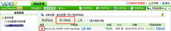 4. 上传成功后列表中有如图4.4所示备份包信息,选中备份包,点击“导入网站包”。